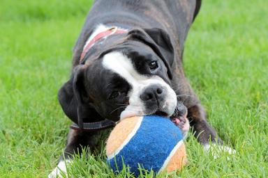 Keywords: dog boxer black and white ball dog look pet animal play let off steam snout curious nibble bite out