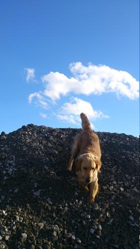 Keywords: dog cute cloud sunny animal play light brown summer young dog race pet rock stones action male golden retriever
