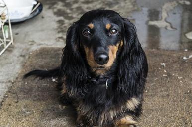 Keywords: dog dachshund pet animal puppy canine purebred domestic cute furry pup companion adorable friend playful sitting doggy staring wiener dog hound