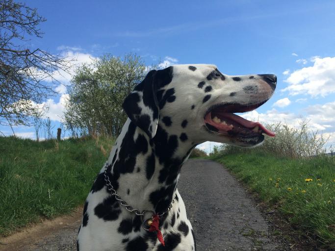 Keywords: dog dalmatian dog ears outdoors path clouds spring walk nature animal sky blue sky landscape