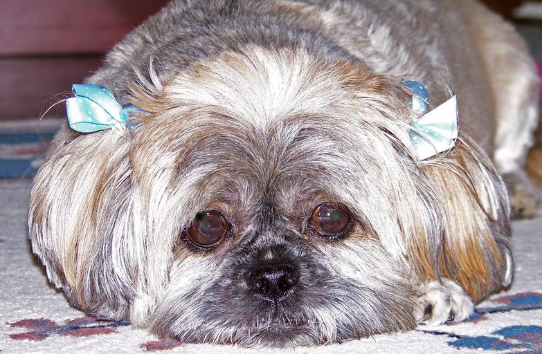 Keywords: dog domestic puppy animal pet canine looking sad purebred shih tzu pedigree mammal companion