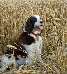 Keywords: dog english springer spaniel spaniel springer springer spaniel wheat field wheat crops grain field agriculture farm land farm sitting animal pet canine pedigree