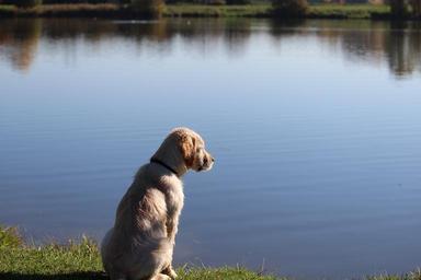 Keywords: dog golden retriever animal sand beige puppy male lake nature water forest domestic animal cute calm zen body of water pet