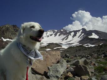Keywords: dog happy mountain pet animal cute canine white portrait smiling mammal purebred pedigree outdoors mt shasta blue sky clouds