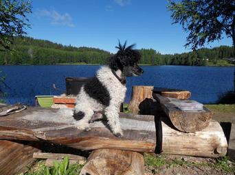 Keywords: dog harlequin poodle lake summer myhinkoski