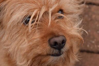 Keywords: dog hybrid small dog brown fur head eyes snout curiosity view watch