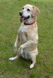 Keywords: dog lady dog males stands playful tongue attention yellow pet
