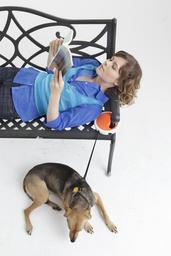 Keywords: dog leash dog woman reading magazine happy pet leash