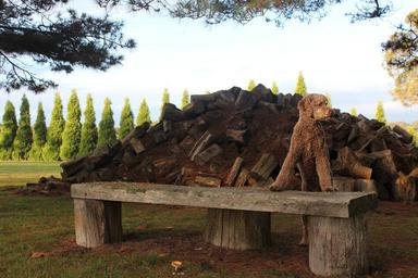 Keywords: dog logs farm wood animal pet canine bench wooden leaning firewood fuel heap