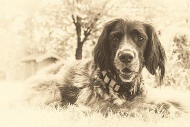 Keywords: dog münsterländer high key old movie sepia hands help old vignette film photo paper film grain grain size german longhaired pointer black and white art artistically