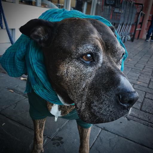 Keywords: dog old pitbull elderly dressed up scarf cold