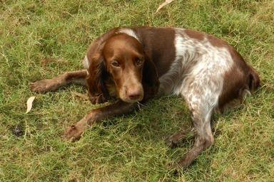 Keywords: dog pet animal sweet lovable springer-spaniel friendly brown spotted domestic pedigree purebred canine furry expression lawn