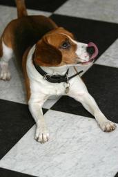 Keywords: dog pet canine domestic puppy mammal licking friend companion looking furry breed purebread beagle laying obedient cute indoors floor paws mutt doggy adorable happy