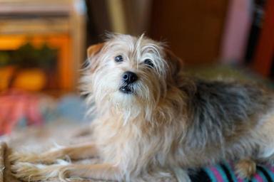 Keywords: dog pet female hybrid small dog mood lying head dog snout fur attention cute animal portrait portrait nose close dog look friendly