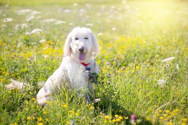 Keywords: dog poodle pet white outdoor wildflowers yellow flower field flowers summer grass