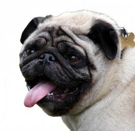 Keywords: dog pug isolated white background animal pet canine breed pedigree face head close-up portrait details tongue panting eyes big funny