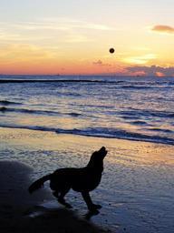 Keywords: dog sea sunset play ball evening sky abendstimmung north sea beach
