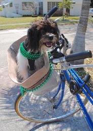 Keywords: dog shih tzu st patrick's day green ireland holiday irish celebration outdoors street beads decoration bicycle puppy cute outside bike pet friend pal
