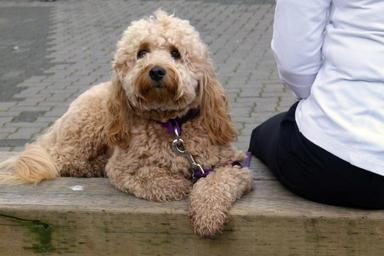 Keywords: dog sitting bench pet canine domestic mammal puppy adorable pedigree doggy friendship friend fluffy leashed obedient together