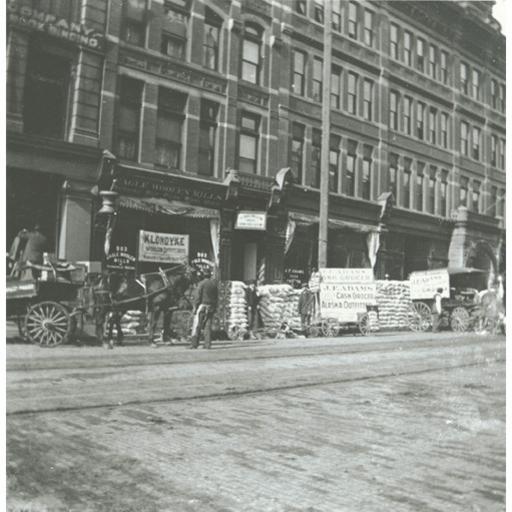 | Keywords: Dog sled team and mining supplies stacked on street in front of J F Adams, Alaska Outfitters store, Seattle, Washington, March (KIEHL 235).jpeg Photograph Creator H Ambrose Kiehl On verso of image Dogsled team in front of J F Adams store Alaska outfitters Seattle Text from Kiehl log Front of Adams store March 1898 Album 2 103 Subjects LCTGM Prospecting equipment supplies Subjects LCSH Sled dogs--Washington State --Seattle; Wagons--Washington State --Seattle; Central business districts--Washington State --Seattle Based on an ad in a January 1898 Post-Intelligencer J F Adams was at 907 First Avenue between Marion and Madison site of the present-day Federal Office Building at 909 First Avenue depicted place Seattle Washington 1898 Institution University of Washington UWASH-KIEHL-source accession number kiehl 235 PD-old-auto-1923 1942 Information field Order Number KHL053 Klondike Gold Rush Sled dogs Wagons Downtown Seattle Washington First Avenue Seattle 1898 in Seattle Black and white photographs |