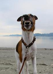 Keywords: dog smooth fox terrier terrier short-haired teeth snarl yawn eating beach background leather collar leash dog on beach small dog pet animal female pedigree purebred dog doggy pet canine cute funny dog