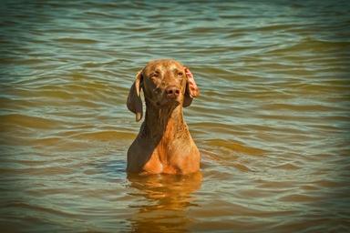 Keywords: dog weimaraner animal pet animal portrait hunting dog joy of life dog breed water beach quadruped waters swim romp fun summer rhine animal world nature wildlife photography attention play brown watch playful rest relax out vigilant curiosity