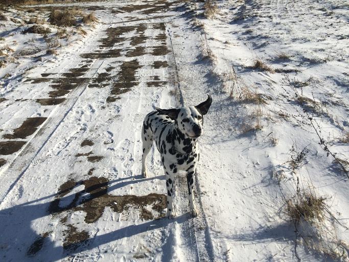 Keywords: dog winter dalmatian path snow nature walk ears dog ears wind
