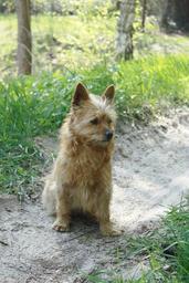 Keywords: dog a yorkshire small animal beige sand green dogs pet siad way forest grass the road in the forest spacer