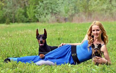 Keywords: dogs doberman yorkie naturally field blonde woman lie beauty dream green grass spring outdoors