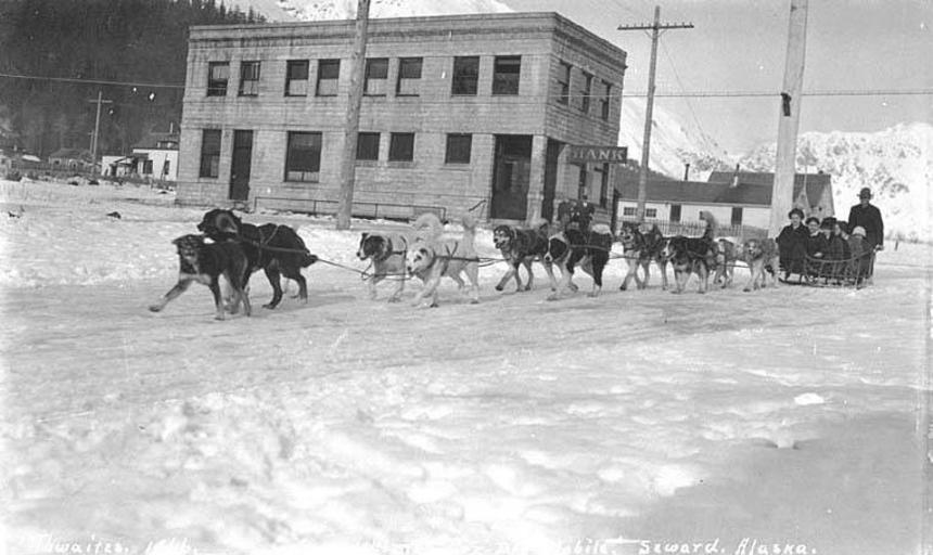 | Keywords: Dogsled team pulling sled full of people down city street, Seward, ca 1912 (THWAITES 239).jpeg check categories 27 October 2016 8 Photograph Creator John E Thwaites Caption on image Speed Limit for Dog-Mobile Seward Alaska PH Coll 247 389 Subjects LCTGM Dogsledding--Alaska--Seward; Dog teams--Alaska--Seward; Passengers--Alaska--Seward; Banks--Alaska--Seward; Dwellings--Alaska--Seward; Utility poles--Alaska--Seward; Snow--Alaska--Seward; Mountains--Alaska Subjects LCSH Sled dogs--Alaska--Seward; Mushers--Alaska--Seward depicted place Seward Alaska ca 1912 Institution University of Washington UWASH-THWAITES-source accession number thwaites 239 PD-old-auto-1923 1940 Information field Order Number THW205 Images from the John E Thwaites Photographs of Alaska Collection to check Passengers Banks Utility poles Snow in Alaska Mountains of Alaska Sled dogs Mushers Seward Alaska |