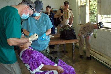 | Keywords: Doing a little dental work DVIDS112839.jpg en Rear Adm Christine S Hunter commander Navy Medicine West right and Capt James P Rice center commander Medical Treatment Facility aboard the Military Sealift Command hospital ship USNS Mercy observe dental procedures by Mercy staff members during her visit to a Pacific Partnership Medical Civic Action Program Pacific Partnership assists the Federated States of Micronesia in providing local communities with various medical dental and engineering civic action programs providing focused humanitarian assistance 2008-08-28 https //www dvidshub net/image/112839 080828-N-+++++-098 2008-09-03 23 04 CHUUK FM PD-USGov-Military-Navy USNS Mercy T-AH-19 Images from DoD uploaded by Fæ |