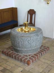 Keywords: Døllefjelde døbefont.JPG en Baptisma font da Døbefont eget værk Erik Damskier Category Døllefjelde Kirke Romanesque baptismal fonts in Denmark