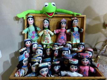 Keywords: dolls hand puppets puppet theatre kermit frog green colorful play papier mâché doll