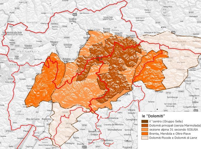 Keywords: Dolomites areas.png en Dolomite Mountains areas colored in different shapes of brown own Sajoch 2010-12-14 Geological maps of the Alps Maps of the Dolomites