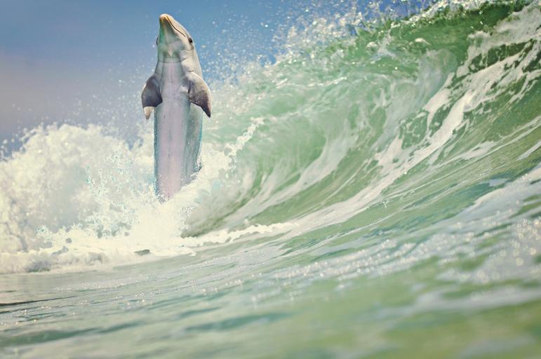 Keywords: dolphin sea wave marine mammals water animals nature mammal pinball jump water creature meeresbewohner swim spray ocean sea water foam inject surf coast