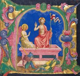 | Keywords: Domenico Pagliarolo - Resurrection, in an initial A - Google Art Project.jpg The letter A of Angelus is appropriately illustrated with the Resurrection for it begins an Easter antiphon that was sung at the hour of Lauds daybreak the time of Christ's Resurrection The illustration is based on Matthew 28 2 “3 An angel of the Lord came down from heaven rolled back the stone and sat on it His countenance was like lightning thus the flame-colored face of the angel and his raiment like snow The artist who signed himself as Domenico of Bologna Dominicus Boñ in white letters above the head of Christ was the father of Girolamo also an illuminator Domenico also painted a Psalter in 1471 and worked with Taddeo Crivelli on the choir books of San Petronio in Bologna He was active until at least 1497 The leaf was already removed in the nineteenth century as Pierpont Morgan purchased it in 1910 as part of the Charles Fairfax Murray collection of old master drawings commons date 15th century commons medium commons dimensions 234 x 245 mm commons institution http //www themorgan org/collection/medieval-and-renaissance/manuscript/113118 id 409 commons location commons references commons object_history commons exhibition_history commons credit_line MS M 444 commons inscriptions commons notes commons accession_number commons source commons permission commons other_versions commons zoom core title Resurrection in an initial A core creator Domenico Pagliarolo core date dateCreated 1475/1499 core location Bologna Italy core format w245 x h234 mm core type Manuscript core relation http //www themorgan org/collections/collections asp id 409 c-089916f9 customtext credit_line Cutting from an Antiphonary in Latin google display_date 1475/1499 google is_artproject TRUE google is_gigapixel FALSE google is_secured TRUE google partner/id 00000000089916f9 google partner/name The Morgan Library Museum google picasa_token osHgQM03xk8POGU5nMgmkNTIO14 special url_id eAEZ1bjpW4y2mA special partner/name_no_lang The Morgan Library Museum PD-old-100-1923 Google Art Project works by Domenico Pagliarolo Pierpont Morgan Library manuscripts Domenico Pagliarolo A as an initial Miniatures of Resurrection of Christ 15th-century illuminated manuscripts from Italy Leaves from divided illuminated manuscripts Antiphonaries |