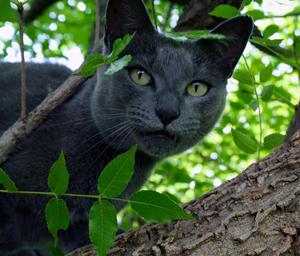 Keywords: domestic cat pet grey animal cute adorable kitty fur home furry fluffy feline love mammal hunting climbing tree leaves outdoors summer eyes