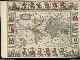 | Keywords: Doncker sea atlas world map.jpg en World map included in the Doncker sea atlas 1659 edition created by Doncker Hendrick 1626-1699 acquired by the Australian Government in 1909 as part of the Petherick Collection of the National Library of Australia <ref>http //nla gov au/nla map-ra10 National Library of Australia - Doncker sea atlas</ref> <references/> http //nla gov au/nla map-ra10-s12 National Library of Australia Cl J Visscher 1652 PD-old-100 Age of Discovery 1650s maps of the world 1652 maps Maps in the National Library of Australia |