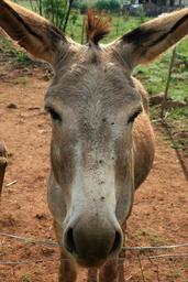 Keywords: donkey grey long ears soft muzzle soil green grass white nose tuft of mane barbed wire front facing sleepy