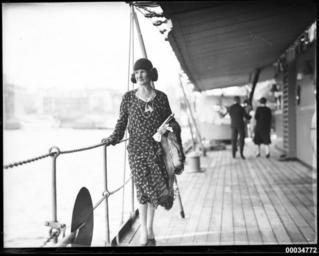 On 10 October, the squadron hosted a reception on board JAVA 'as a return for the hospitality they had received while in Sydney'. The SMH reported that distinguished guests were greeted by the Dutch Consul-General P E Teppema, Madame Teppema and Rear-Admiral Kayser. This image depicts the Italian Consul-General Antonio Grossardi's wife, Donna Adelaide Grossardi, who was described as wearing 'black printed silk and a black velour hat'.