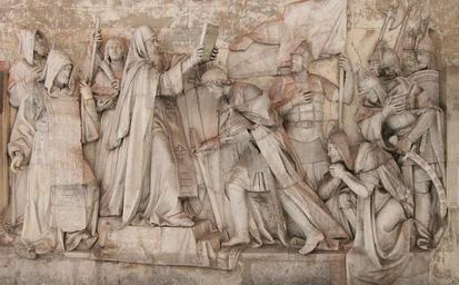 | Keywords: DonskoyRelief5.jpg Artwork Creator Alexander Vasilievich Loganovsky en Sergius of Radonezh blesses Prince Dmitry Donskoy before the campaign against Mamai and sends with him the monks Peresvet and Oslyabya Trinity Lavra of St Sergius Trinity Monastery before the Battle of Kulikovo The warrior monks Alexander Peresvet Peresvet and Oslyabya stand on the left and are depicted in schema garments Sergius of Radonezh is depicted in the centre with a raised icon Dmitry Donskoy bends down before him Ба ельеф изоб ажает посещение w Дмит ий Иванович Донской Дмит ием Донским ru Т оице-Се гиева лав а Т оицкого монасты я ru пе ед Куликовская битва Куликовской битвой ru Воины-иноки Александ Пе есвет Пе есвет ru и Родион Ослябя Ослябя ru стоят слева одеты в схимнические одеяния Се гий Радонежский ru изоб ажён в цент е с иконой в уках пе ед ним склонил голову п инимая благословение Дмит ий Иванович Донской Дмит ий Донской ru 2011-01-17 Го ельеф 1847 1849 гг Фотог афия 2011-01-17 г Technique marble Shchusev State Museum of Architecture and housed at the Donskoy Monastery Го ельеф находится в собственности Госуда ственный научно-исследовательский музей а хитекту ы имени А В Щусева узея а хитекту ы им А В Щусева ru ; х анится в Донской монасты ь Донском монасты е ru Moscow object history Cathedral of Christ the Saviour destroyed in the end of 1931 Before the total demolition of the cathedral the relief was dismounted now 2012 it is housed in Moscow at Donskoy Monastery ; the bronze replica of Loganovsky s relief is mounted on the northern façade of the rebuilt cathedral амо ный го ельеф аботы А В Логановского был установлен на фасаде w Х ам Х иста Спасителя Х ама Х иста Спасителя ru взо ванного в конце 1931 г езадолго до аз ушения х ама го ельеф был демонти ован В настоящее в емя 2012 г п оизведение х анится в оскве на те ито ии Донской монасты ь Донского монасты я ru ; б онзовое повто ение го ельефа Логановского азмещено на севе ном фасаде воссозданного х ама exhibition history credit line accession number Ludvig14 See below <gallery> File Christ the Saviour Cathedral preserved part no 3 Donskoy Monastery Moscow jpg File SG109197 17 JPG File SG109197 19 JPG File Донской монасты ь 019 jpg </gallery> 55 42 52 303947 N 37 36 14 528894 E source exif_heading LangSwitch See also См также <gallery> File Moscow - Cathedral of Christ the Saviour jpg LangSwitch The bronze replica of the relief mounted on the façade of the rebuilt Cathedral of Christ the Saviour Б онзовое повто ение го ельефа азмещённое на фасаде восстановленного Х ама Х иста Спасителя File Stamp of Russia 2005 No 1049 Battle of Kulikovo jpg LangSwitch The relief on the stamp <small>The souvenir sheet of Russia 2 August 2005 Michel No 1281 Block 83 Scott No 6923 </small> Го ельеф на почтовой ма ке <small>Почтовый блок России 2 августа 2005 г Каталог ИТЦ « а ка» 1049 </small> </gallery> PD-old-100 self cc-by-sa-3 0 GFDL Ludvig14 1855 Reliefs of Original Christ the Saviour Cathedral Donskoy Monastery Reliefs of Christian saints in Russia Dmitry Donskoy in sculpture Alexander Peresvet Sergius of Radonezh in sculpture Blessing in art |