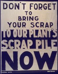 | Keywords: Don't Forget to Bring Your Scrap To Our Plant's Scrap Pile Now^ - NARA - 533961.jpg Scope and content General notes 533961 Local identifier 179-WP-104 Office for Emergency Management War Production Board 01/1942 - 11/03/1945 Still Picture Records Section Special Media Archives Services Division NWCS-S National Archives at College Park 8601 Adelphi Road College Park MD 20740-6001 other date circa 1942 1943 Record group Record Group 179 Records of the War Production Board 1918 - 1947 Record group ARC 508 War Production Board compiled 1942 - 1943 Series ARC 533858 File unit File unit ARC Variant control numbers NAIL Control Number NWDNS-179-WP-104 Other versions <gallery> File Don't_Forget_to_Bring_Your_Scrap_To_Our_Plant's_Scrap_Pile_Now _-_NARA_-_533961 tif tif File Don't_Forget_to_Bring_Your_Scrap_To_Our_Plant's_Scrap_Pile_Now _-_NARA_-_533961 jpg jpg </gallery> NARA-cooperation PD-USGov World War II posters from the United States Metal recycling in the United States Recycling in the United States in World War II |