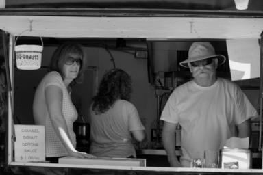 Keywords: bw blackandwhite black white monochrome streetphotography donuts doughnuts foodtruck mustache hat food contrasts street glasses canada kelowna bc britishcolumbia people man male female women okanagan