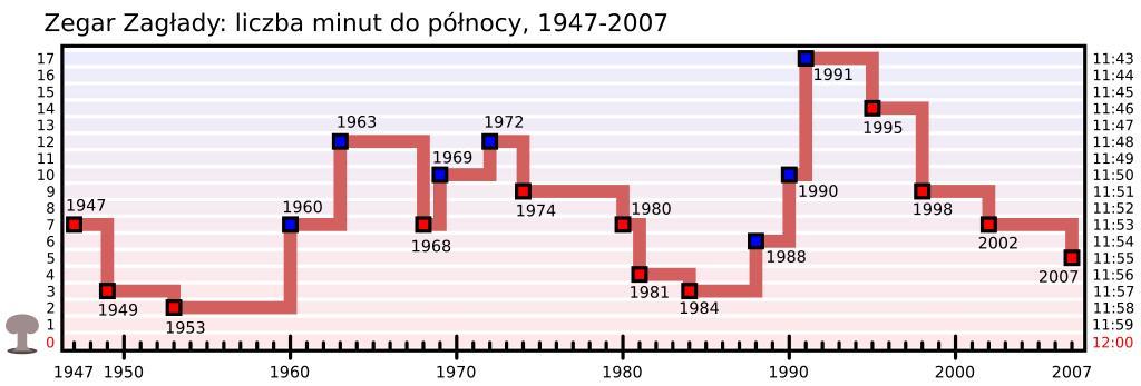 | Keywords: Doomsday Clock graph pl.svg Doomsday Clock of the Bulletin of the Atomic Scientists Numbers at left refer to the minutes to midnight nuclear war as the values of the clock are usually expressed At right are the raw times if anyone cares The little mushroom cloud is meant to remove any ambiguity about which direction is more positive Polish translation File Doomsday Clock graph svg Fastfission malarz pl original 2007-01-17; translation 2009-04-27 Fastfission malarz pl Original Image translated to Spanish Image translated to Russian Doomsday Clock checked |