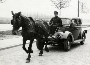 | Keywords: tweede wereldoorlog tweedewereldoorlog 1941 ford ford v8 fordv8 paard taxi gas shortage gasshortage petrol paard en wagen paardenwagen horse drawn car revamped commons:event=commonground2009 riding sport animal blackandwhite outdoor monochrome black and white Spaarnestad Photo/SFA003008007 Tweede Wereldoorlog. Tijdens de Duitse bezetting in Nederland maakte men gebruik van de auto zonder brandstof/benzine wegens tekorten. Op de foto wordt een Ford V8 getrokken door een paard. Op de plaats waar de motor zat, zit nu de taxibestuurder. Nederland, Den Haag, 14 mei 1941. Second World War. During the German occupation of The Netherlands people used a car without gasoline/fuel because of shortages. In this picture a Ford V* is drawn by a horse. The spot that would usually holds the engine is now being used as the drivers' seat. Holland, The Hague, may 14th 1941 Spaarnestad Photo/SFA003008007 Tweede Wereldoorlog. Tijdens de Duitse bezetting in Nederland maakte men gebruik van de auto zonder brandstof/benzine wegens tekorten. Op de foto wordt een Ford V8 getrokken door een paard. Op de plaats waar de motor zat, zit nu de taxibestuurder. Nederland, Den Haag, 14 mei 1941. Second World War. During the German occupation of The Netherlands people used a car without gasoline/fuel because of shortages. In this picture a Ford V* is drawn by a horse. The spot that would usually holds the engine is now being used as the drivers' seat. Holland, The Hague, may 14th 1941 |