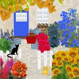 Keywords: door window flowers garden house facade architecture old house flower box cat sunflowers basket apples closing watering can black cat nature