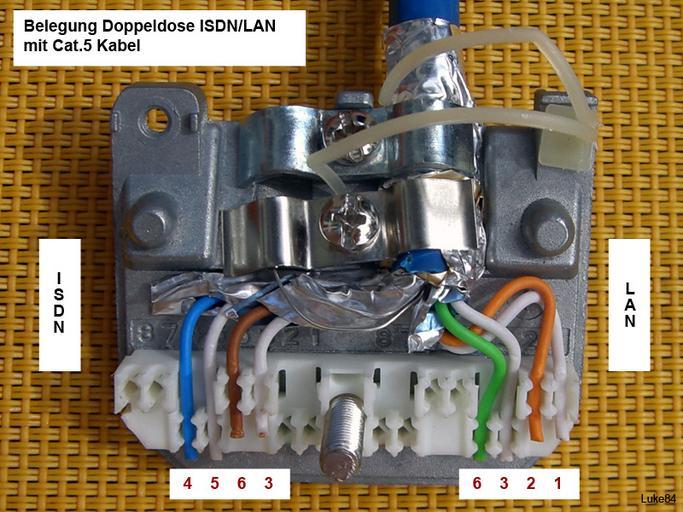 Keywords: Doppelbelegung mit Cat.5.jpg Die korrekte Doppelbelegung einer RJ45-Doppeldose mit Cat 5-Kabel zum gleichzeitigen Anschluss von LAN und ISDN 2007-07-18 own assumed Luke84 ISDN Ethernet cables Insulation displacement connectors