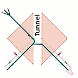 Keywords: Doppelprisma.png Double prism tunneling svg diagramm of a double prisma experiment showing tunneling photons Own 2007-10-05 Jochen Magnus joma-co by the author joma-co Quantum tunneling Total internal reflection