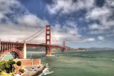Keywords: dorato san francisco red clouds sky space perspective bridge america u s bay sea landscape day light day water green blue