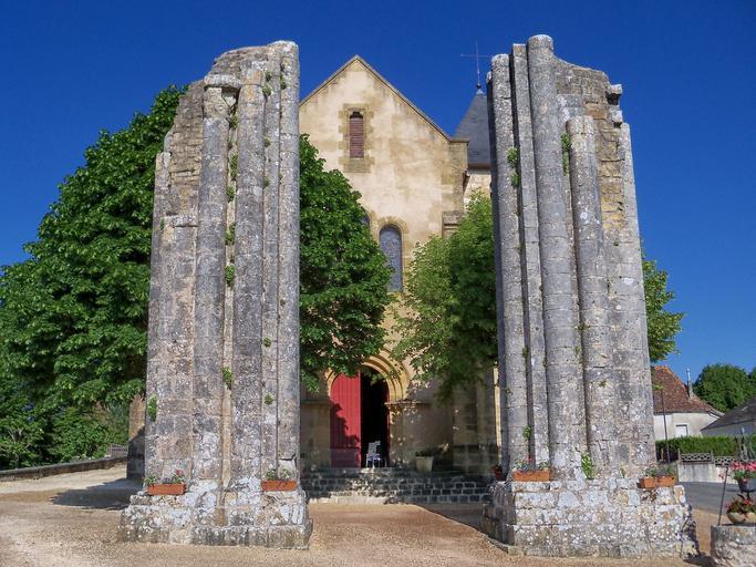Keywords: dordogne france church building architecture outside trees columns monument flowers